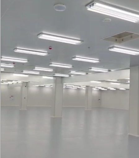 夹丝玻璃挡烟垂壁是固定式刚性挡烟垂壁的一种类型。刚性挡烟垂壁,顾名思义材质比较坚硬。成都29所8号厂房项目中挡烟垂壁使用的是6mm夹丝玻璃,其加工工艺是:在玻璃加热软化过程中,置入铁丝网,再通过低温冷却,便得到夹丝玻璃。夹丝玻璃内部铁丝网较为细密,将整片玻璃紧紧粘合在一起,在受到外力冲击的情况下,玻璃碎片不会掉落,安全性比单片防火玻璃好。夹丝玻璃一般制作为磨砂工艺,其透明度不高,但安装在吊顶下有一种朦胧的美感。